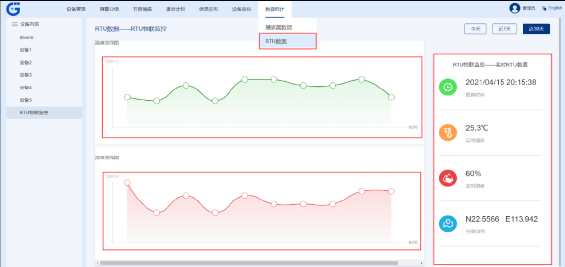 数据联动:通过点击“RTU 数据”模块,外接传感器(温湿度/GPS等)自动采集数据,同步至大屏可视化更新